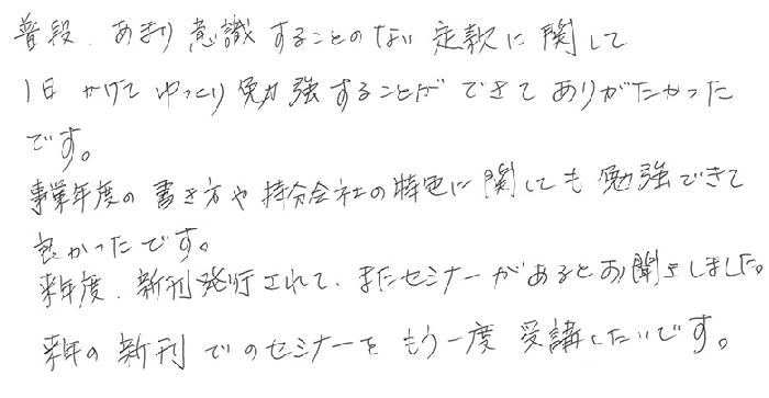 普段、あまり意識することのない定款に関して1日かけてゆっくり勉強することができてありがたかったです。事業年度の書き方や持分会社の特色に関しても勉強できて良かったです。来年度、新刊発行されて、またセミナーがあるとお聞きしました。来年の新刊でのセミナーをもう一度受講したいです。