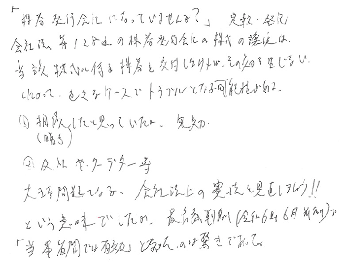 本日も貴重な内容を教えていただきありがとうございました。本題と離れた内容になりますが、以前からお話しされていた、街宣車対策として、お話しされた方法で対応できてしまうことは、どこにも無い方法で今後その様な事案があれば参考にさせていただきます。又、自己株式の取得、譲渡承認請求を使い特定の株主から買い取る方法は、目からウロコの方法でこの話を聞けただけで今回参加しただけの価値がありました。