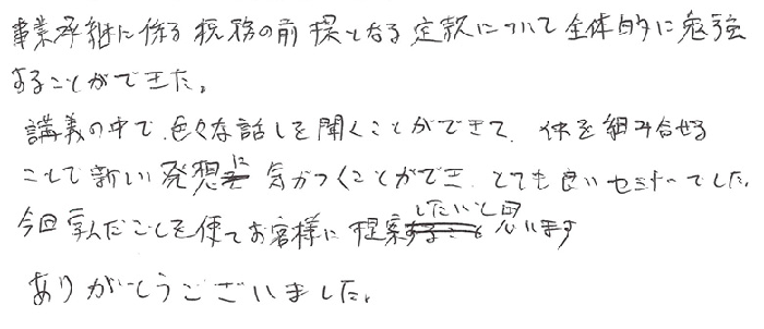 事業承継に係る税務の前提となる定款について全体的に勉強することができた。講義の中で、色々な話しを聞くことができて、それを組み合せることで新しい発想に気がつくことができ、とても良いセミナーでした。今回学んだことを使ってお客様に提案したいと思います。ありがとうございました。