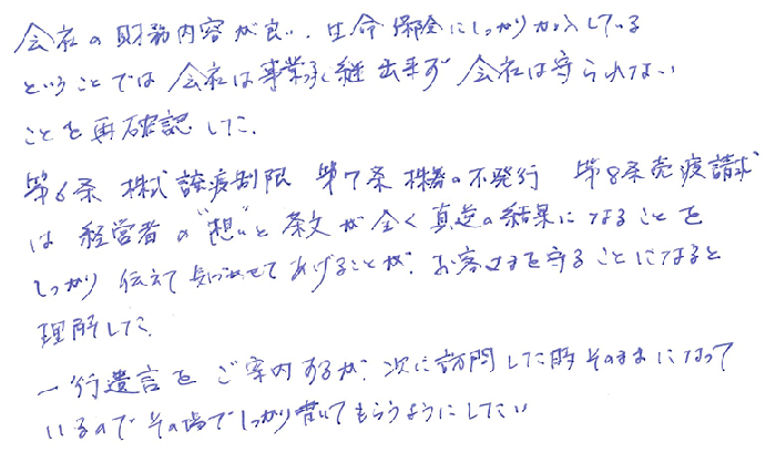 会社の財務内容が良い。生命保険にしっかり加入しているということでは、会社は事業承継出来ず会社は守られないことを再確認した。第6条 株式譲渡制限、第7条 株券の不発行、第8条 売渡請求は経営者の“想い”と条文が全く真逆の結果になることをしっかり伝えて気づかせてあげることが、お客さまを守ることになると理解した。一行遺言をご案内するが、次に訪問した時そのままになっているので、その場でしっかり書いてもらうようにしたい。