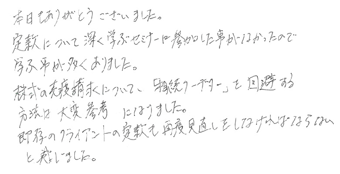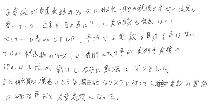 本日もありがとうございました。定款について深く学ぶセミナーに参加した事がなかったので学ぶ事が多くありました。株式の売渡請求について、「相続クーデター」を回避する方法は大変参考になりました。既存のクライアントの定款も再度見直しをしなければならないと感じました。