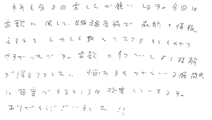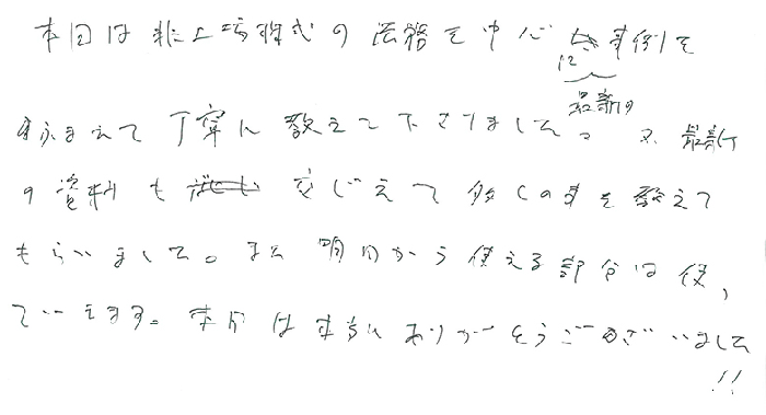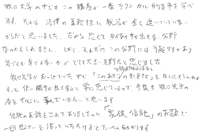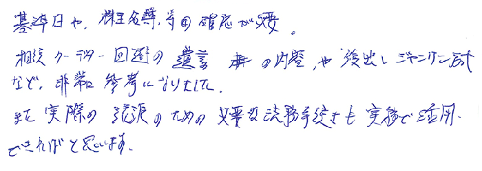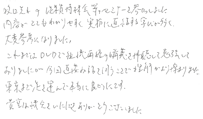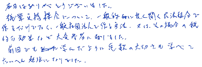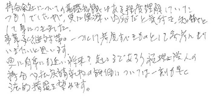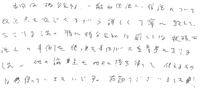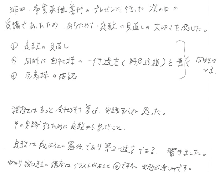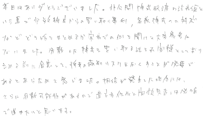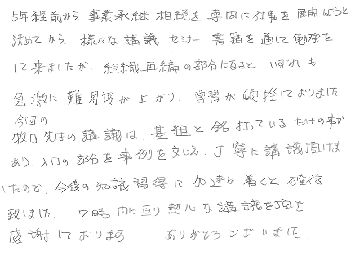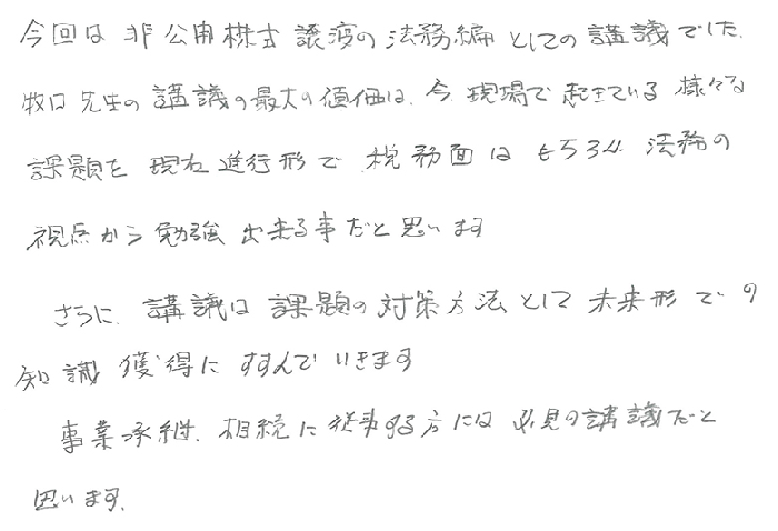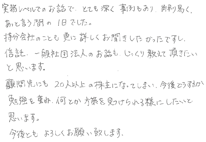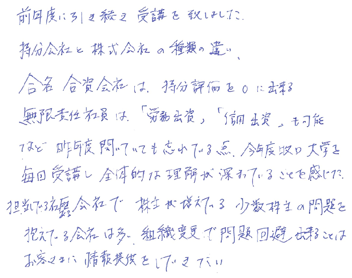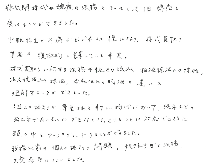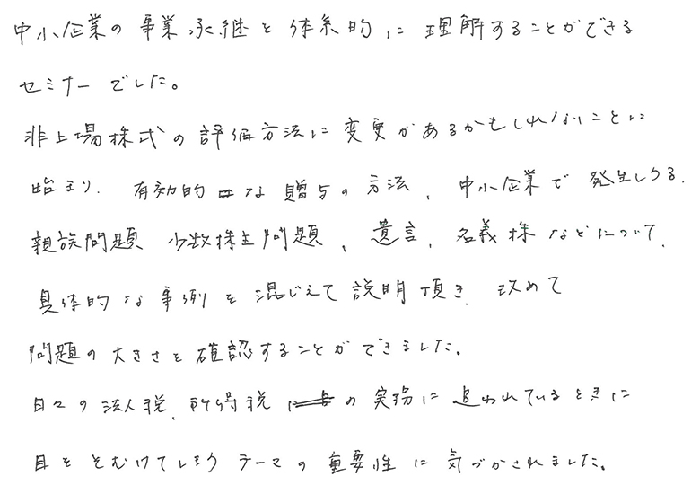 実務レベルでのお話でとても深く事例もあり、解り易く、あっという間の1日でした。持分会社のことも更に詳しくお聞きしたかったですし、信託、一般社団法人のお話もじっくり教えて頂きたいと思います。顧問先にも20人以上の株主になってしまい、今後どうするか勉強を重ね何とか方策を見つけられる様にしたいと思います。今後とも宜しくお願い致します。
