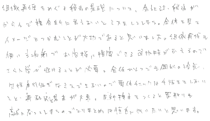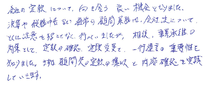 会社の定款について、向き合う良い機会となりました。決算や税務申告など、通常の顧問業務では、会社法について、とくに注意をすることなく行っていましたが、相談、事業承継の対策として、定款の確認、定款変更と、一行遺言の重要性を知りました。まずは顧問先の定款の収集と内容確認を実践していきます。