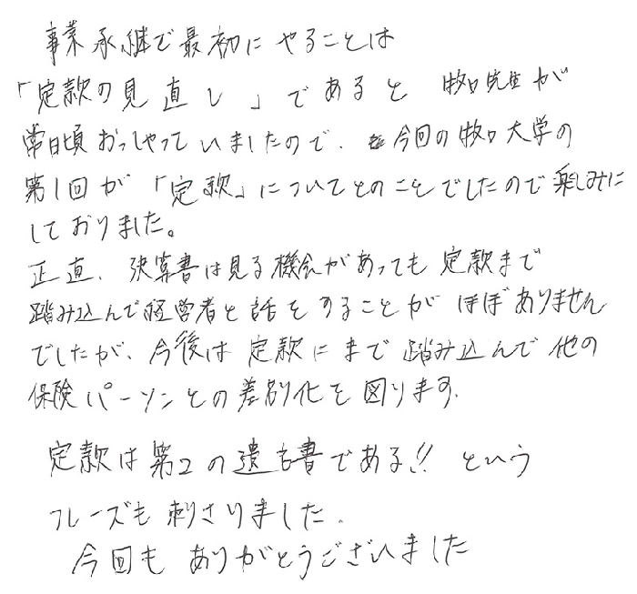 事業承継で最初にやることは「定款の見直し」であると牧口先生が常日頃おっしゃっていましたので、今回の牧口大学の第1回が「定款」についてとのことでしたので楽しみにしておりました。正直、決算書は見る機会があっても定款まで踏み込んで経営者と話をすることがほぼありませんでしたが、今後は定款にまで踏み込んで他の保険パーソンとの差別化を図ります。定款は第2の遺言書である!!というフレーズも刺さりました。今回もありがとうございました。
