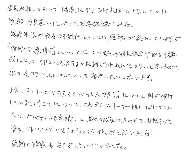 事業承継において一番先にやらなければいけないことは「定款の見直し」ということを再認識しました。譲渡制限や株券の不発行については確認が終わっていますが、「株式の売渡請求」については、その会社の株主構成や目指す構成によって、個々に規定するか検討しなければならないと思うので、次は、全クライアントについてここを確認したいと思います。また、ファミリービジネスのガバナンスの在り方について、国が検討しているということについて、これからはオーナー株主だけではなく、ガバナンスも意識して、会社の成長にあわせて、目指すべき姿をアドバイスできるようにしなければと思いました。最新の情報もありがとうございました。