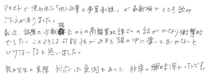 テキストで使われた「中小企業の事業承継」が最新版でとても読みごたえがありました。最近、話題の少数株主からの高額買取請求の話がかなり衝撃的でした。このような可能性があると頭の中に置いておかないといけないなと思いました。牧口先生の実際対応した実例もあって非常に興味深かったです。