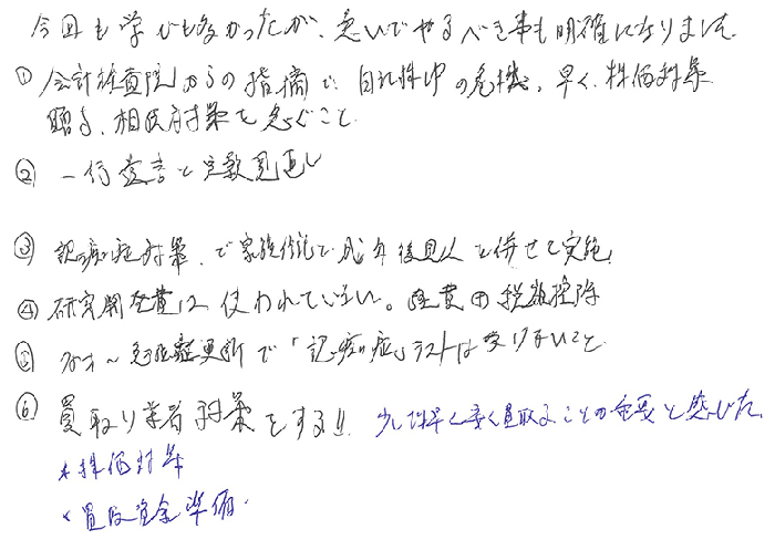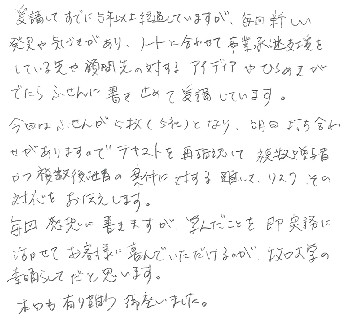 受講してすでに5年以上経過していますが、毎回新しい発見や気づきがあり、ノートに合わせて事業承継支援をしている先や顧問先の対するアイディアやひらめきがでたらふせんに書き止めて受講しています。今回はふせんが5枚(5社)となり、明日打ち合わせがありますのでテキストを再確認して、複数贈与者かつ複数後継者の案件に対する難しさ、リスク、その対応をお伝えします。毎回感想に書きますが、学んだことを即実務に活かせてお客様に喜んでいただけるのが、牧口大学の素晴らしさだと思います。本日も有り難う御座いました。