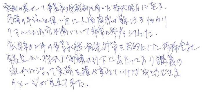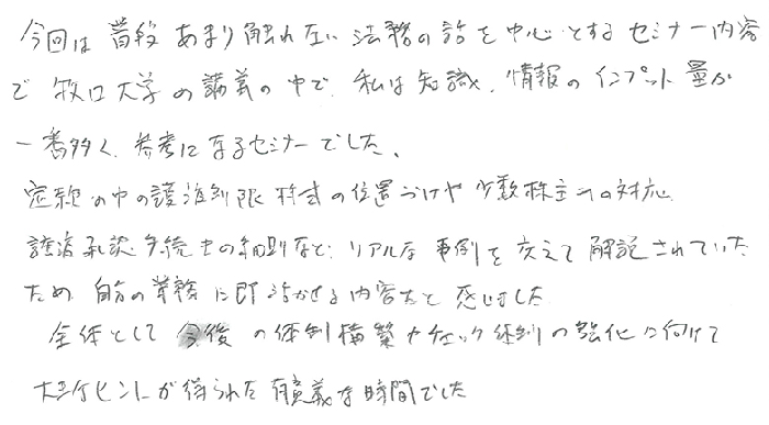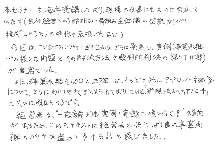 本セミナーは、毎年受講しており、現場の仕事にも大いに役立っています(会社経営という枠組み・骨組み全体像の把握ならびに“株式”というモノの特性や取り扱い方など)。今回は、これまでのレクチャー組立から、さらに発展し、実例(事業承継での様々な問題とその解決方法や裁判所判決の掘り下げ等)が豊富でした。また、《事業承継を切口とした際、どこからアプローチするか》について、さらにわかりやすくまとめられており、これは「新規法人へのアプローチ」に大いに役立ちそうです。経営者は“一般論よりも実例・実話に食い付く!”傾向があるためこれをテキストに経営者と共に、より良い事業承継のカタチを造ってつける!!と感じました。