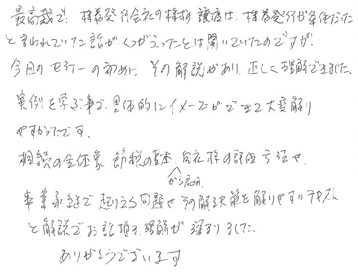 最高裁で、株券発行会社の株式譲渡は、株券発行が条件だったと言われていた話がくつがえったとは聞いていたのですが今日のセミナーの初めにその解説があり、正しく理解できました。実例を学ぶ事で具体的にイメージができて大変解りやすかったです。相続の全体像、節税の基本から応用、自社株の評価方法や事業承継で起りえる問題やその解決策を解りやすいテキストと解説でお話頂き理解が深まりました。ありがとうございます。