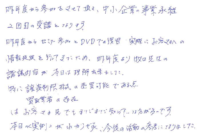 昨年度から参加をさせて頂き、中小企業の事業承継2回目の受講となります。昨年度からセミナー参加とDVDでの復習、実際にお客様への情報提供を行ってきたため、昨年度より牧口先生の講義内容が本日は理解出来ました。特に譲渡制限株式の売買可能である点、買取業者の存在はお客さま先でもまだまだ知っていない方が多いです。本日の〈実例〉がわかりやすく、今後の活動の参考になりました。