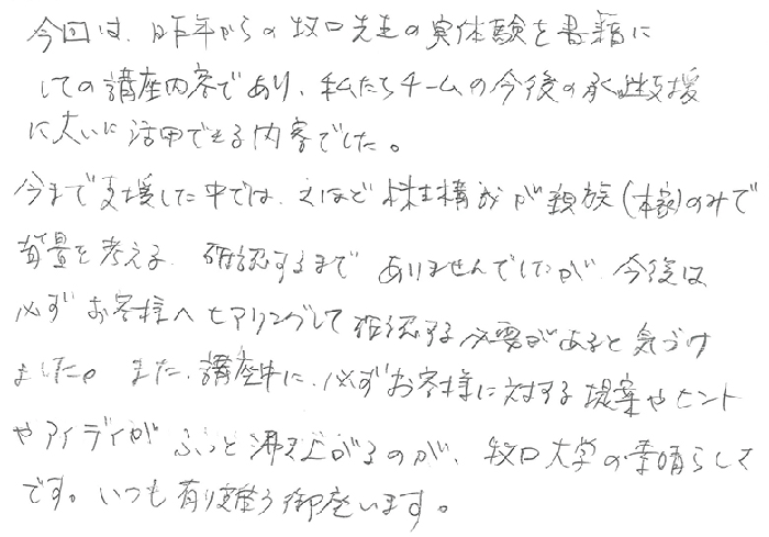 今回は昨年からの牧口先生の実体験を書籍にしての講座内容であり、私たちチームの今後の承継支援に大いに活用できる内容でした。今まで支援した中ではさほど株主構成が親族(本家)のみで背景を考える。確認するまでありませんでしたが今後は必ずお客様へヒアリングして確認する必要があると気づけました。また講座中に必ずお客様に対する提案やヒントやアイデアがふっと湧き上がるのが牧口大学の素晴らしさです。いつも有り難う御座います。