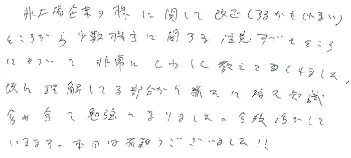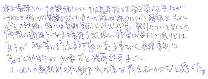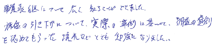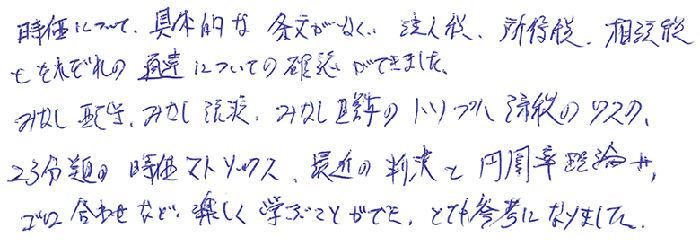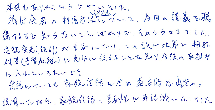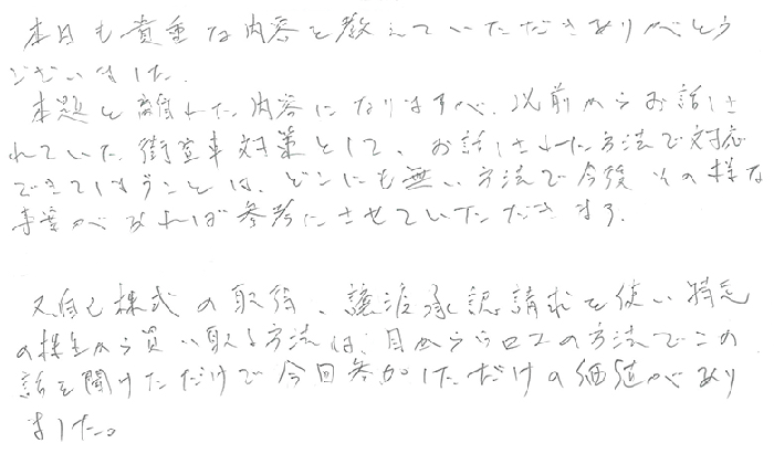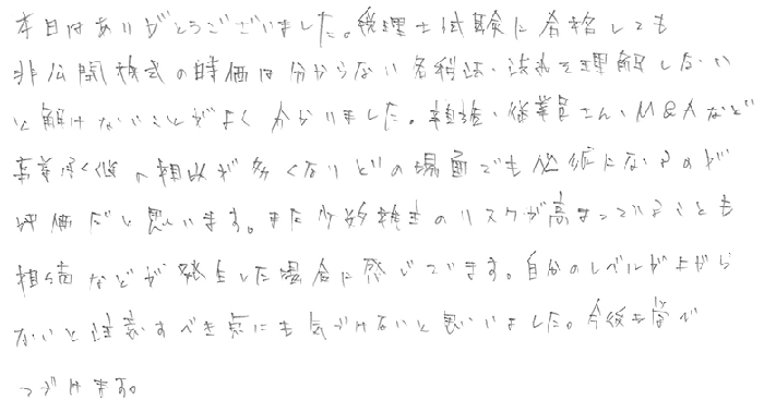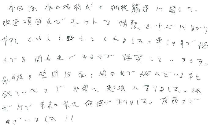 本日は非上場株式の法務を中心に最新の事例をふまえて丁寧に教えてくださいました。又、最新の資料も交えて多くの事を教えてもらいました。また明日から使える部分は使っていきます。本日は本当にありがとうございました!!