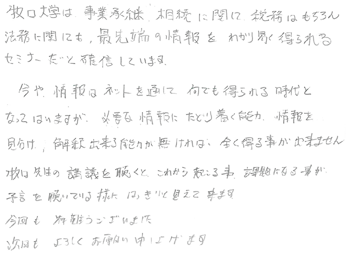 牧口大学は事業承継、相続に関して税務はもちろん法務に関しても、最先端の情報をわかり易く得られるセミナーだと確信しています。今や情報はネットを通して何でも得られる時代となってはいますが、必要な情報にたどり着く能力、情報を見分け、解釈出来る能力が無ければ全く得る事が出来ません。牧口先生の講義を聴くとこれから起こる事、課題になる事が予言を聴いている様にはっきりと見えて来ます。今回も有難うございました。次回もよろしくお願い申し上げます。