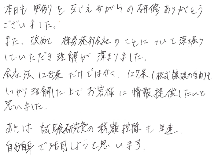 本日も実例を交えながらの研修ありがとうございました。また、改めて株券発行会社のことについて深堀りしていただき理解が深まりました。会社法128条だけではなく、127条(株式譲渡の自由)もしっかり理解した上でお客様に情報提供をしたいと思いました。あとは試験研究費の税額控除も早速自分自身で活用しようと思います。