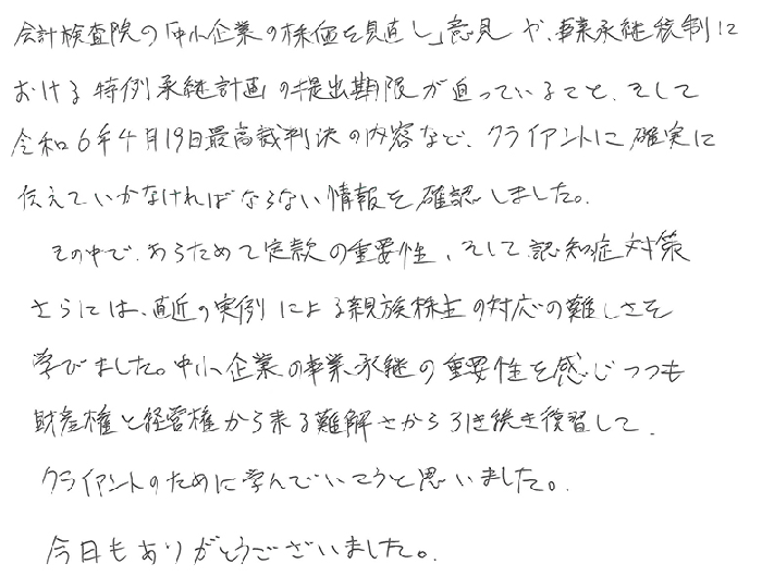 会計検査院の「中小企業の株価を見直し」意見や事業承継税制における特例承継計画の提出期限が迫っていること、そして令和6年4月19日最高裁判決の内容など、クライアントに確実に伝えていかなければならない情報を確認しました。その中で、あらためて定款の重要性、そして認知症対策さらには直近の実例による親族株主の対応の難しさを学びました。中小企業の事業承継の重要性を感じつつも財産権と経営権から来る難解さから引き続き復習して、クライアントのために学んでいこうと思いました。今日もありがとうございました。