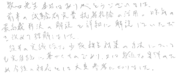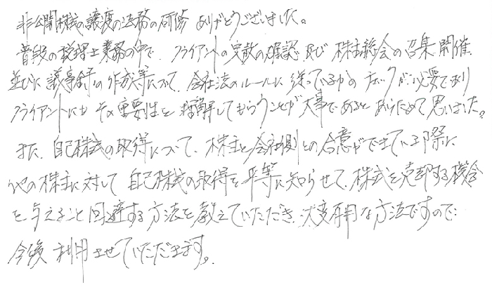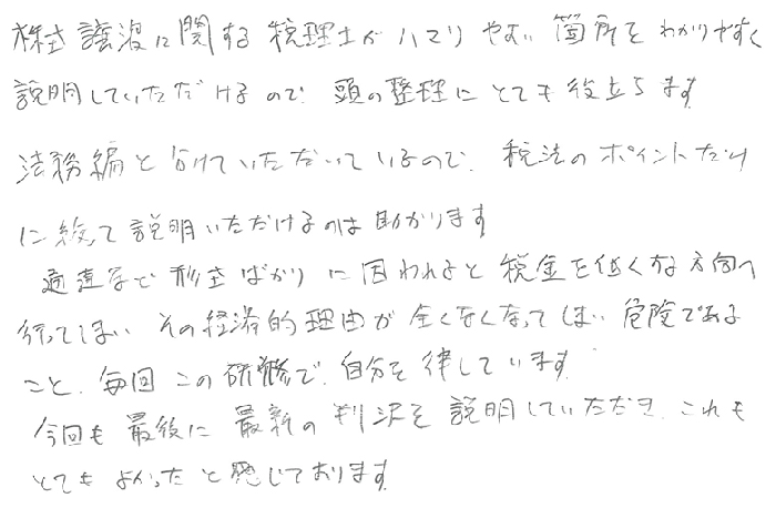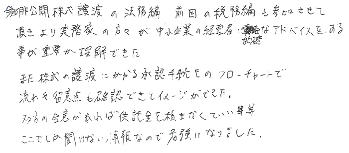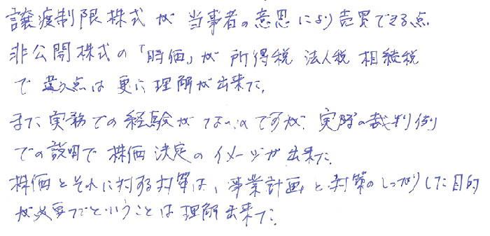 非公開株式の譲渡の法務の研修ありがとうございました。普段の税理士業務の中で、クライアントの定款の確認及び株主総会の召集、開催、並びに議事録の作成等について、会社法のルールに従っているかのチェックが必要でありクライアントにもその重要性を理解してもらうことが大事であるとあらためて思いました。また、自己株式の取得について、株主と会社側との合意ができている際に他の株主に対して自己株式の取得を平等に知らせて、株式を売却する機会を与えること回避する方法を教えていただき、大変有用な方法ですので今後利用させていただきます。