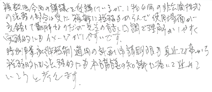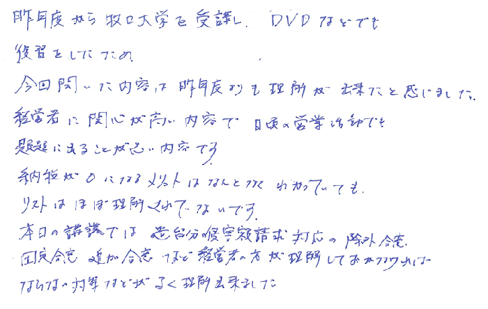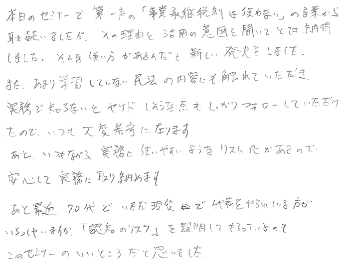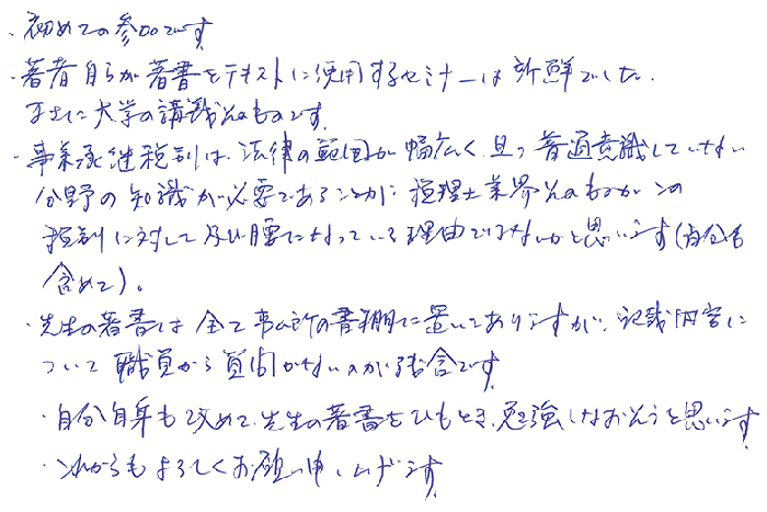 初めての参加です。著者自らが著書をテキストに使用するセミナーは新鮮でした。まさに大学の講義そのものです。事業承継税制は法律の範囲が幅広く且つ普通意識していない分野の知識が必要であることが税理士業界そのものがこの税制に対して及び腰になっている理由ではないかと思います(自分も含めて)。先生の著書は全て事務所の書棚に置いてありますが記載内容について職員から質問がないのが残念です。自分自身も改めて先生の著書をひもとき、勉強しなおそうと思います。これからも宜しくお願い申し上げます。
