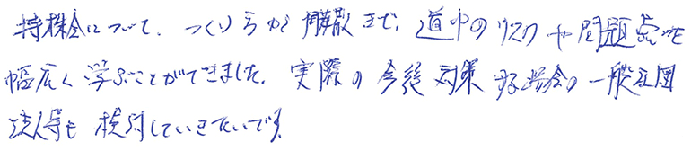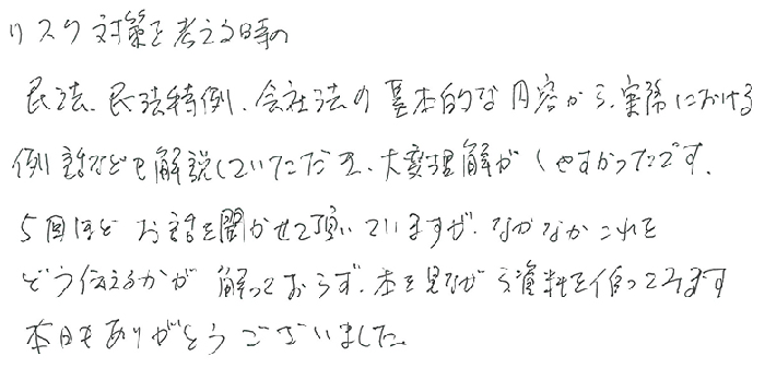 リスク対策を考える時の民法、民法特例、会社法の基本的な内容から、実務における例話なども解説していただき大変理解がしやすかったです。5回ほどお話を聞かせて頂いていますが、なかなかこれをどう伝えるかがわかっておらず本を見ながら資料を追ってみます。本日もありがとうございました。