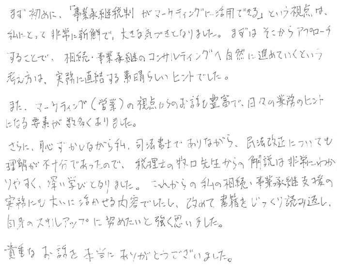 まず初めに、「事業承継税制がマーケティングに活用できる」という視点は、私にとって非常に新鮮で、大きな気づきとなりました。まずはそこからアプローチすることで、相続・事業承継のコンサルティングへ自然に進めていくという考え方は、実務に直結する素晴らしいヒントでした。またマーケティング(営業)の視点からのお話も豊富で、日々の業務のヒントになる要素が数多くありました。さらに恥ずかしながら私、司法書士でありながら、民法改正についても理解が不十分であったので、税理士の牧口先生からの解説は非常にわかりやすく、深い学びとなりました。これからの私の相続、事業承継支援の実務にも大いに活かせる内容でしたし、改めて書籍をじっくり読み返し、自信のスキルアップに努めたいと強く思いました。貴重なお話をありがとうございました。