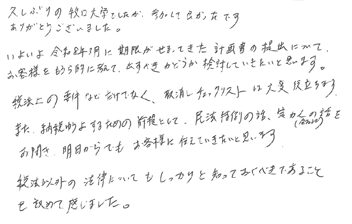 久しぶりの牧口大学でしたが参加して良かったです。ありがとうございました。いよいよ令和8年3月に期限がせまってきた計画書の提出についてお客様をもうら的に考えて出すべきかどうか検討していきたいと思います。税法上の事件などだけでなく、取消しチェックリストは大変役立ちます。また、納税猶予するための前提として、民法特例の話、定款の話をお聞き、明日からでもお客様に伝えていきたいと思います。税法以外の法律についてもしっかりと知っておくべきであることを改めて感じました。