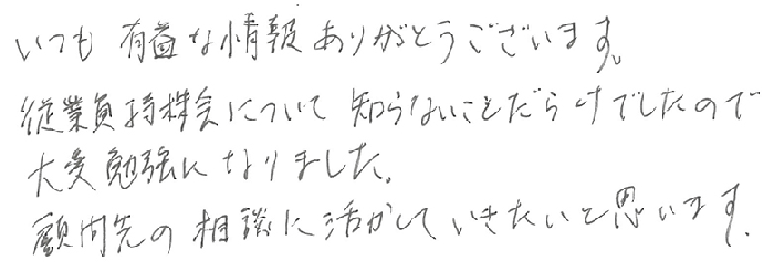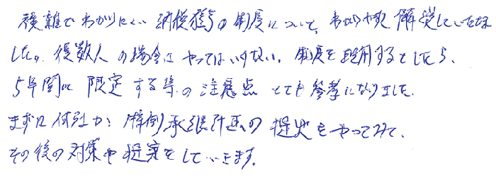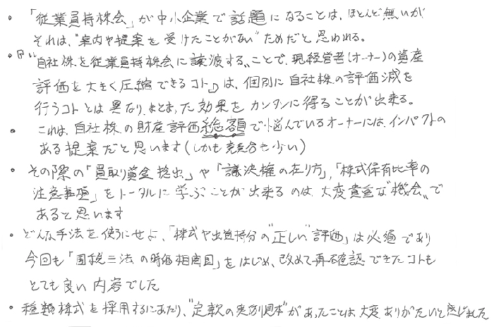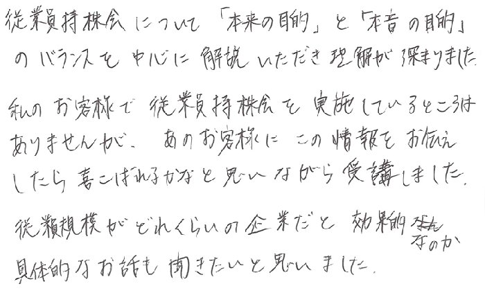 久しぶりに参加させて頂きましたが、従業員持株会のテーマは2度目でした。1度目に聞いた時よりも内容が頭に入ってきたので繰り返して聞く事は大事だなと思いました。昨今の無議決権化する話は気になっていたので聞けて嬉しかったです。親族外承継の件で気になっていた点も解決できました。有難うございました。