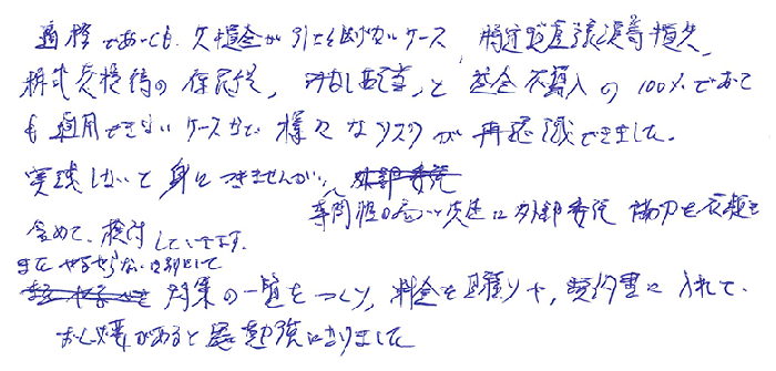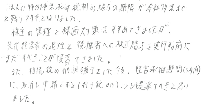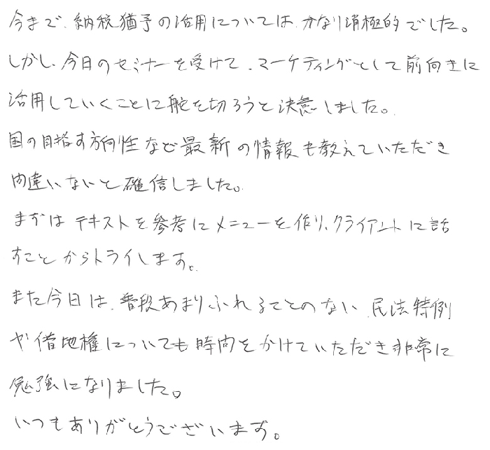 今まで納税猶予の活用についてはかなり消極的でした。しかし今日のセミナーを受けて、マーケティングとして前向きに活用していくことに舵を切ろうと決意しました。国の目指す方向性など最新の情報も教えていただき間違いないと確信しました。まずはテキストを参考にメニューを作りクライアントに話をすることからトライします。また今日は普段あまりふれることのない民法特例や借地権についても時間をかけていただき非常に勉強になりました。いつもありがとうございます。