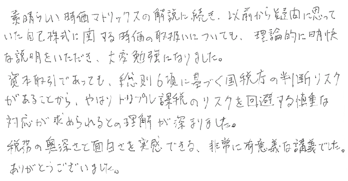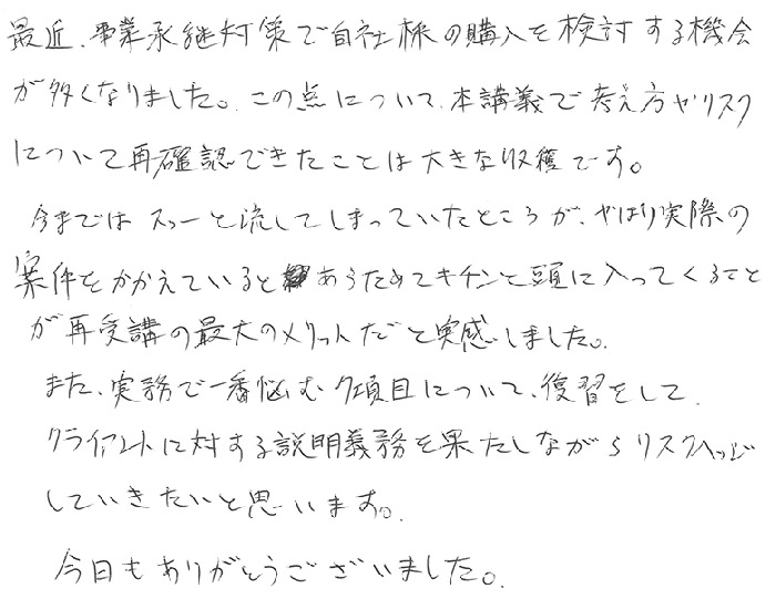最近、事業承継対策で自社株の購入を検討する機会が多くなりました。この点について本講義で考え方やリスクについて再確認できたことは大きな収穫です。今まではスーッと流してしまっていたところが、やはり実際の案件をかかえているとあらためてキチンと頭に入ってくることが再受講の最大のメリットだと実感しました。また、実務で一番悩む7項目について、復習をしてクライアントに対する説明義務を果たしながらリスクヘッジしていきたいと思います。今日もありがとうございました。