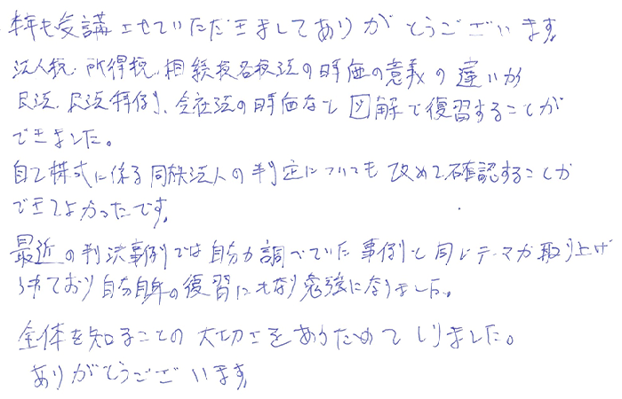 本年も受講させていただきましてありがとうございます。法人税、所得税、相続税各税法の時価の意義の違いから民法、民法特例、会社法の時価など図解で復習することができました。自己株式に係る同族法人の判定についても改めて確認することができてよかったです。最近の判決事例では自分が調べていた事例と同じテーマが取り上げられており自分自身の復習にもなり勉強になりました。全体を知ることの大切さをあらためてしりました。ありがとうございます。