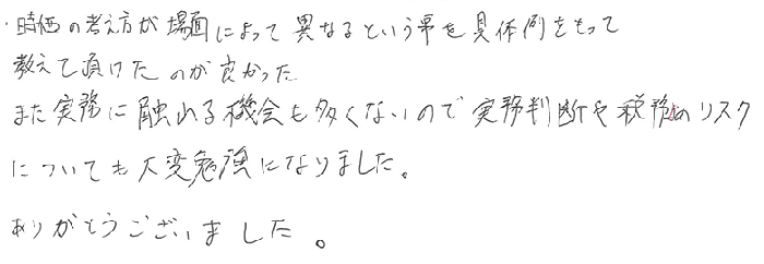 時価の考え方が場面によって異なるという事を具体例をもって教えて頂けたのが良かった。また実務に触れる機会も多くないので実務判断や税務のリスクについても大変勉強になりました。ありがとうございました。