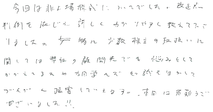 今回は非上場株式についてでした。改正点判例を混じえ詳しくわかりやすく教えてくださりました。特に少数株主の取扱いに関しては弊社の顧問先でも悩みとして抱えているため本日学んだ知識を生かしてがんがん提案していきます。本日は有難うございました。
