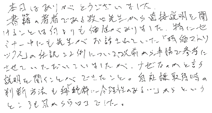 本日はありがとうございました。書籍の著者である牧口先生から直接説明を聞けることは何よりも価値がありました。特にセミナー中にも先生がお話されていた「時価マトリックス」の仕訳22例について以前から事務で参考にさせていただいていましたが、ナゼなのかと言う説明を聞くことができたこと。自社株取得時の判断方法も「純粋に合理性のある…」からというところも目からウロコでした。