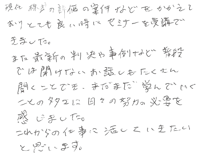 現在株式の評価の案件などをかかえておりとても良い時にセミナーを受講できました。また最新の判決や事例など普段では聞けないお話もたくさん聞くことでき、まだまだ学んでいくことの多さに日々の努力の必要を感じました。これからの仕事に活していきたいと思います。