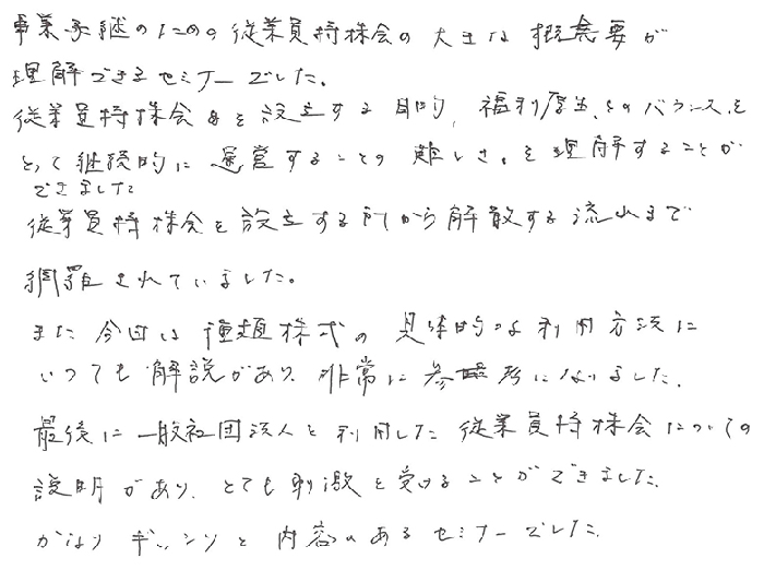 事業承継のための従業員持株会の大きな概要が理解できるセミナーでした。従業員持株会を設立する目的、福利厚生とのバランスをとって継続的に運営することの難しさ、を理解することができました。従業員持株会を設立する所から解散する流れまで網羅されていました。また今日は種類株式の具体的な利用方法についても解説があり、非常に参考になりました。最後に一般社団法人を利用した従業員持株会についての説明がありとても刺激を受けることができました。かなりギッシリと内容のあるセミナーでした。