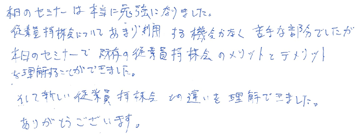 本日のセミナーは本当に勉強になりました。従業員持株会についてあまり利用する機会がなく苦手な部分でしたが、本日のセミナーで既存の従業員持株会のメリットとデメリットを理解することができました。そして、新しい従業員持株会との違いを理解できました。ありがとうございます。