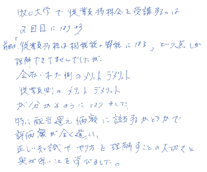 牧口大学で従業員持株会を受講するのは2回目になります。前回は「従業員持株は相続税の節税になる」という点しか理解できていませんでしたが、会社、オーナー側のメリット・デメリット、従業員側のメリット・デメリットが分かるようになりました。特に配当還元価額に該当するかどうかで評価額が全く違い正しい知識ややり方を理解することの大切さと奥が深い事を学びました。