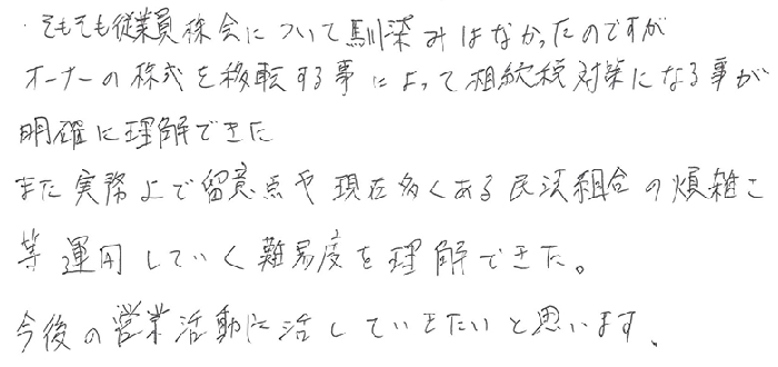 そもそも従業員持株会について馴染みはなかったのですが、オーナーの株式を移転する事によって相続税対策になる事が明確に理解できた。また実務上で留意点や現在多くある民法組合の煩雑さ等運用していく難易度を理解できた。今後の営業活動に活かしていきたいと思います。