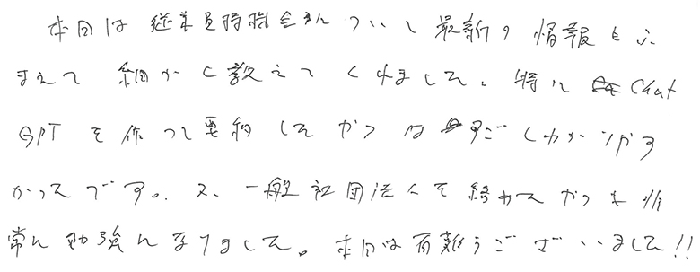 本日は従業員持株会について最新の情報をふまえて細かく教えてくれました。特にChatGPTを作って要約したやつはすごくわかりやすかったです。又、一般社団法人を絡めたやつも非常に勉強になりました。本日は有難うございました!!