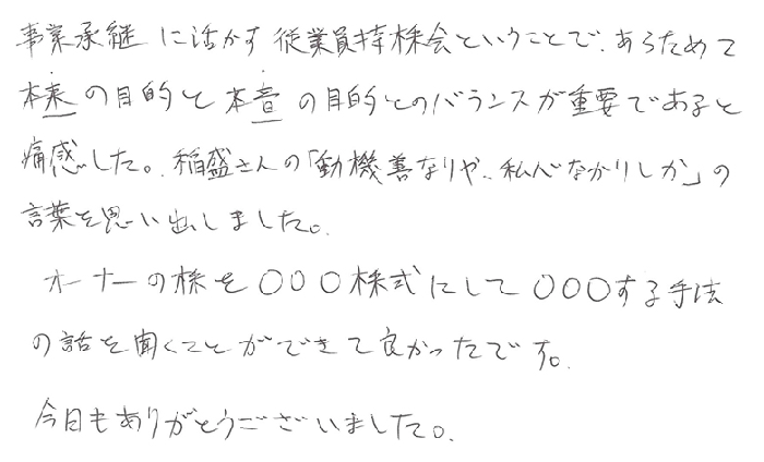 事業承継に活かす従業員持株会ということで、あらためて本来の目的と本音の目的とのバランスが重要であると痛感した。稲盛さんの「動機善なりや、私心なかりしか」の言葉を思い出しました。オーナーの株を◯◯◯株式にして◯◯◯する手法の話を聞くことができて良かったです。今日もありがとうございました。