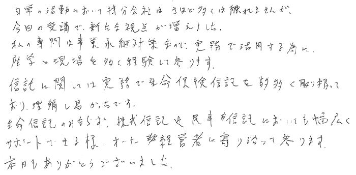 日常の活動において持分会社はさほど多くは触れませんが、今回の受講で新たな視点が増えました。私の専門は事業承継対策なので実務で活用するために座学と現場を多く経験して参ります。信託に関しては実務で生命保険信託を数多く取り扱っており、理解し易かったです。生命信託のみならず、株式信託や民事信託においても幅広くサポートできる様、オーナー経営者に寄り添って参ります。本日もありがとうございました。