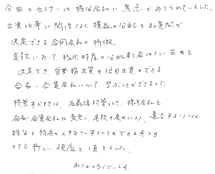 今回のセミナーは持分会社に焦点があてられていました。出資比率に関係なく損益の分配を社員間で決定できる合同会社の特徴。定款において、残余財産の分配割合にない旨を決定でき、労務出資や信用出資ができる合名、合資会社について学ぶことができました。特筆すべきは名義株対策として、株式会社を合名、合資会社に変更し、定款の定めにより遺言することなく持分を特定の人物にすることができる点です。とても新しい視座を頂きました。ありがとうございます。