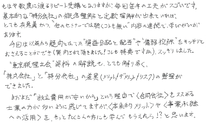 もはや数度に渡るリピート受講となりますが、毎回毎年の工夫がスゴいです。基本的な「持分会社」の概念理解と定款理解が出来ていれば、とても有意義かつ“他のセミナーでは聴くコトも無い”内容の連続で、学びがいがあります。今回は以前から疑問となってた“損益分配と配当”や“債務控除”をキッチリとおさえることができ(質問させて頂きました!コレも特典ですね)スッキリしました。“東京税理士会”資料の解説もとても解り易く「株式会社」と「持分会社」の差異(メリット/デメリット/リスク)の整理ができました。まだまだ「設立費用が安いから」という理由で〈合同会社〉をススめる士業の方が多いように感じてますが〈本来的メリット〉や〈事業承継への活用〉をもっとたくさんの方にも学んでもらえたら!?と思います。