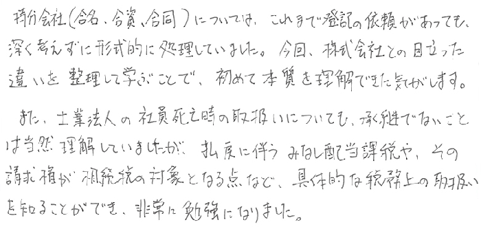 持分会社(合名、合資、合同)については、これまでの登記の依頼があっても、深く考えずに形式的に処理していました。今回、株式会社との目立った違いを整理して学ぶことで初めて本質を理解できた気がします。また、士業法人の社員死亡時の取扱いについても、承継でないことは当然理解していましたが、払戻に伴うみなし配当課税や、その請求権が相続税の対象となる点など、具体的な税務上の取扱いを知ることができ、非常に勉強になりました。