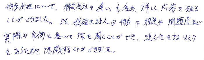 持分会社について、株式会社の違いも含め、詳しく内容を知ることができました。また、税理士法人の持分の相談や問題点など実際の事例に基づいて話を聞くことができ、法人化をするリスクを改めて認識することができました。