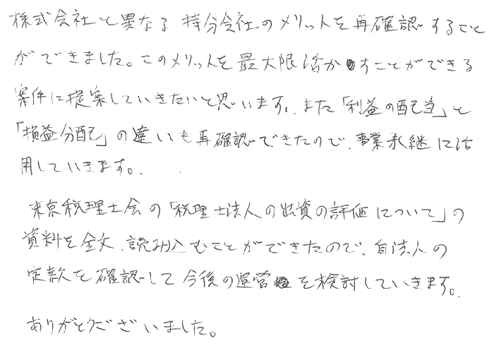 株式会社と異なる持分会社のメリットを再確認することができました。このメリットを最大限活かすことができる案件に提案していきたいと思います。また「利益の配当」と「損益分配」の違いも再確認できたので事業承継に活用していきます。東京税理士会の「税理士法人の出資の評価について」の資料を全文読み込むことができたので、自法人の定款を確認して今後の運営を検討していきます。ありがとうございました。