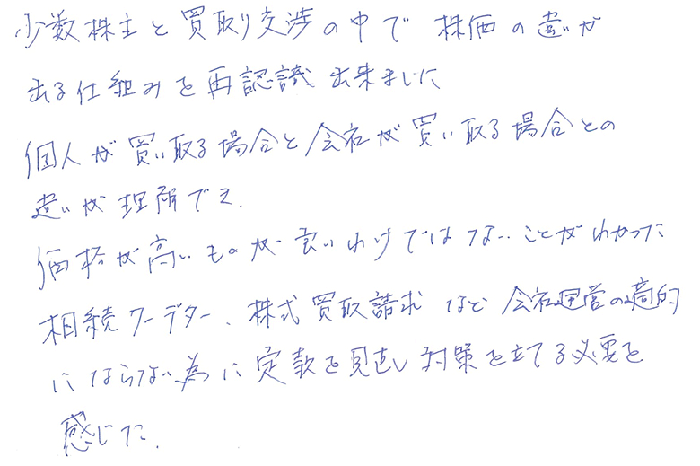 少数株主と買取り交渉の中で株価の違いが出る仕組みを再認識出来ました。個人が買い取る場合と会社が買い取る場合との違いが理解でき、価格が高いものが良いわけではないことがわかった。相続クーデター、株式買取請求など会社運営の敵対的にならない為に定款を見直し対策を立てる必要を感じた。