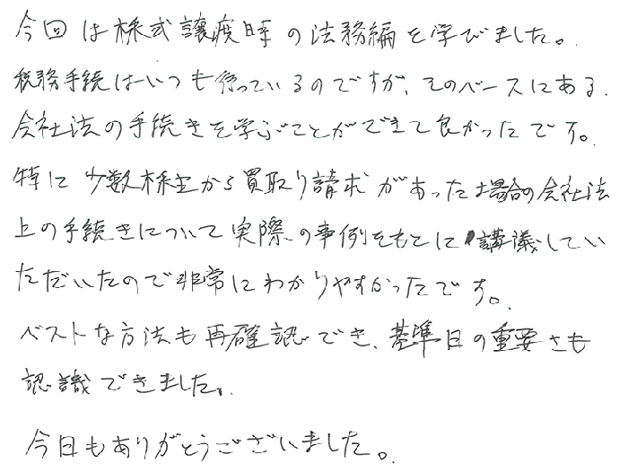 今回は株式譲渡時の法務編を学びました。税務手続はいつも行っているのですが、そのベースにある会社法の手続きを学ぶことができて良かったです。特に少数株主から買取り請求があった場合の会社法上の手続きについて実際の事例をもとに講義していただいたので非常にわかりやすかったです。ベストな方法も再確認でき、基準日の重要さも認識できました。今日もありがとうございました。