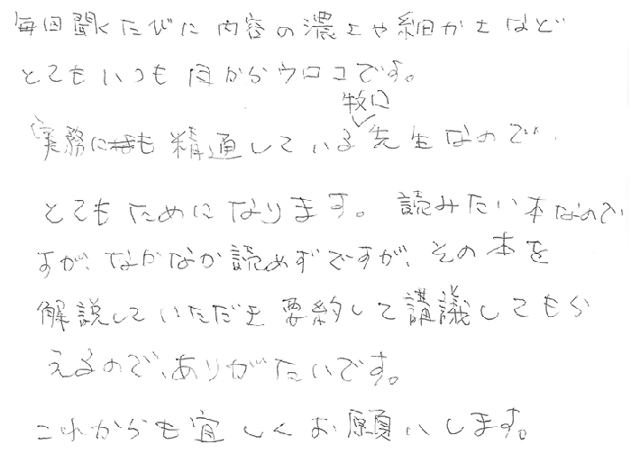毎回聞くたびに内容の濃さや細かさなどとてもいつも目からウロコです。実務にも精通している牧口先生なのでとてもためになります。読みたい本なのですが、なかなか読めずですが、その本を解説していただき要約して講義してもらえるので、ありがたいです。これからも宜しくお願いします。