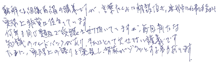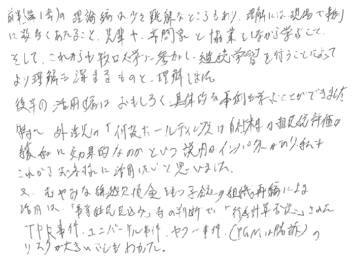 難解な組織再編の講義ですが、言葉たくみに解説頂き、進行中仕事にも生かせ実務上非常に役立っています。何年も同じ題目で受講させて頂いていますが、毎回新たな知識のフィードバックがあり、私にとって欠かせない講義です。たまに、実務上の誤りと発見し、背筋がゾクッとする事もあります。
