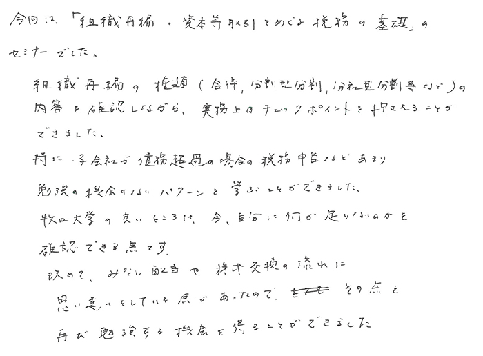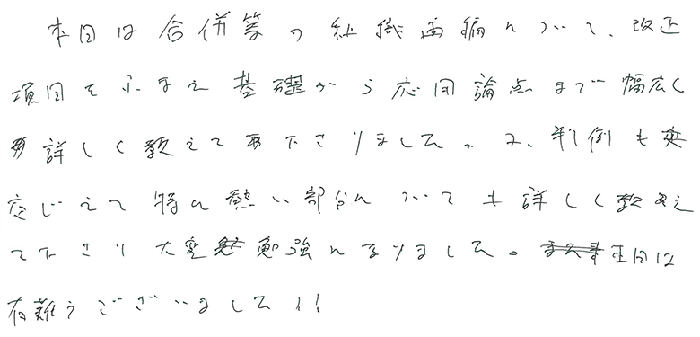 本日は合併等の組織再編について改正項目をふまえ基礎から応用論点まで幅広く詳しく教えて下さりました。又、判例も交えて特に熱い部分についても詳しく教えて下さり大変勉強になりました。本日は有難うございました!!
