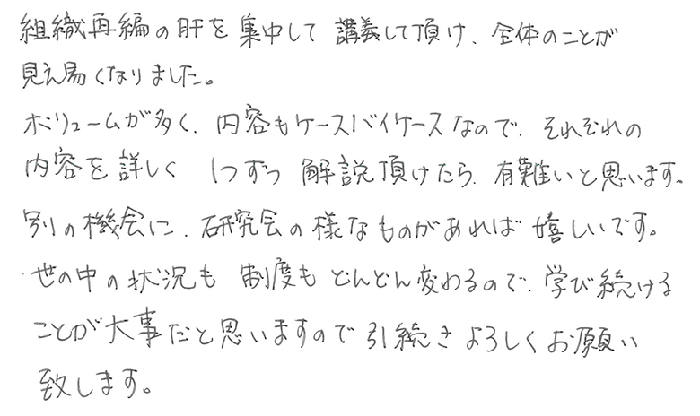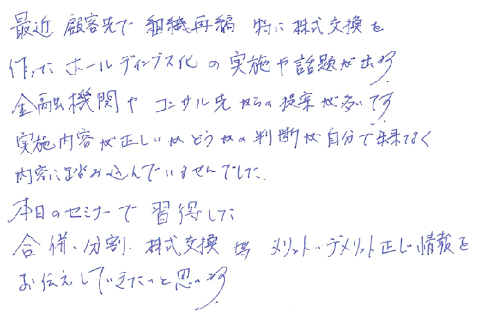 組織再編の肝を集中して講義して頂け、全体のことが見え易くなりました。ボリュームが多く、内容もケースバイケースなので、それぞれの内容を詳しく1つずつ解説頂けたら有難いと思います。別の機会に、研究会の様なものがあれば嬉しいです。世の中の状況も制度もどんどん変わるので、学び続けることが大事だと思いますので引続きよろしくお願い致します。